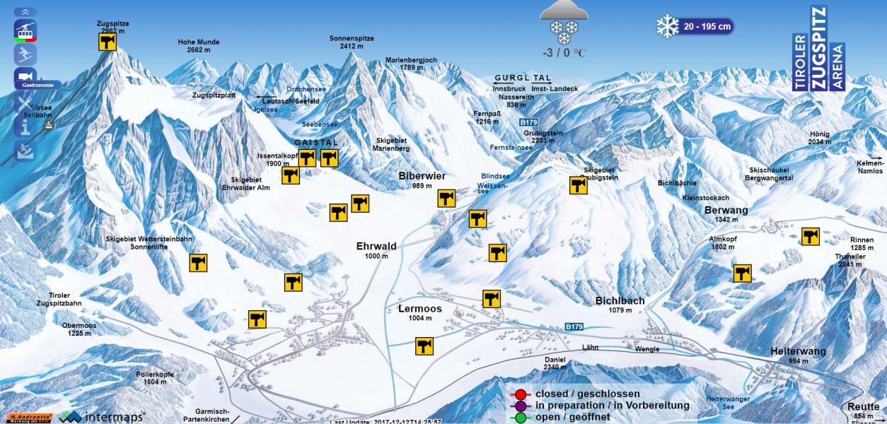 Die interaktive Karte bietet Euch Livecams und den besten Überblick über die Bahnen der Tiroler Zugspitz Arena.
