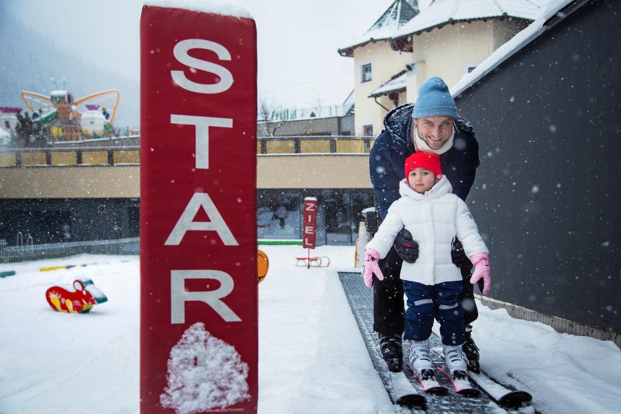 - Windelskischule (2,5-3,5 Jahre) direkt in unserem Familienhotel Alpenrose, auf dem gekühlten und beschneiten Dach der Tiefgarage